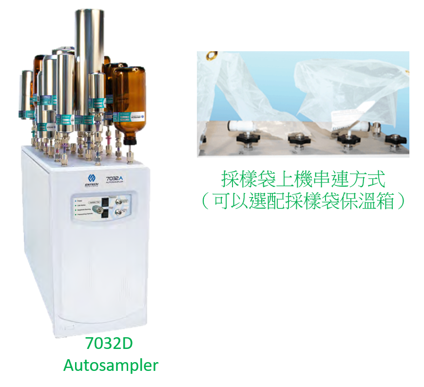 7032D自動進樣器串接GC-FID,系統符合『排放管道中氣態有機化合物檢測方法-採樣袋採樣/氣相層析火焰離子化偵測法(NIEA A722.76B)』。 7032D內建21個進樣位置,可連接採樣袋(Tedlar®袋) 、Bottle-Vacs™及MiniCans。可以擴充搭配GC-MSD, GC-SCD, GC-PFPD連用使用。